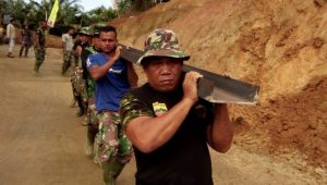 Tampak sejumlah personel Satgas melangsir besi UNF dari titik nol pembukaan badan jalan menuju ke sisi dekat Jembatan Bah Bolon. Pelangsiran material besi dilakukan dengan dipanggul secara beramai-ramai oleh personel yang ada. Bahkan Dansatgas juga ikut memanggul besi UNF yang beratnya mencapai seratusan kilogram itu.
