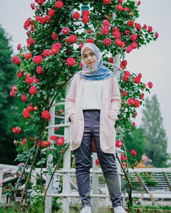 7. Tips terakhir, kamu juga bisa memadukan pakaian polosmu dengan hijab motif yang bernuansa colorful.