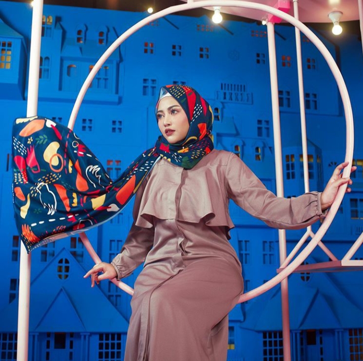 4. Hijab motif juga bisa lho dipakai bersamaan dengan pakaian bermotif. Tapi kamu harus pandai menyesuaikan antara hijab dan baju kamu agar tidak terlihat terlalu meriah.