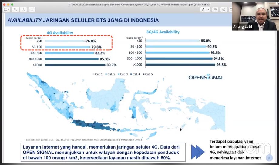 “Dari data Open Signal, ketersediaan sinyal 4G di pedalaman Kalimantan dan Papua di bawah 80%. Artinya ada 80% orang yang belum menikmati 4G. Ketimpangan ini menjadi PR pemerintah,” kata Anang dalam diskusi virtual yang diadakan oleh Yayasan Lembaga Konsumen Indonesia (YLKI), Rabu (20/5/2020).