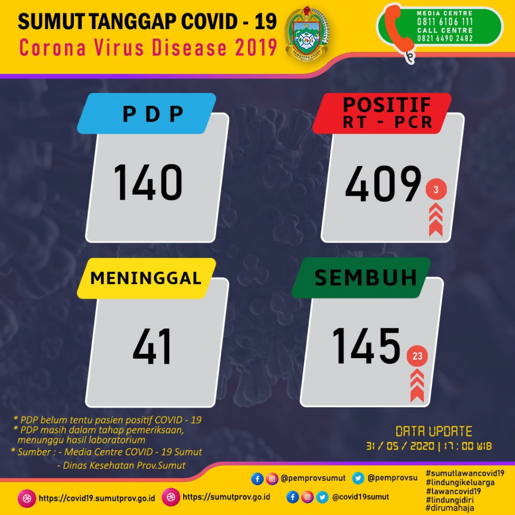 Indiespot.id-Medan, Gugus Tugas Percepatan Penanganan (GTPP) COVID-19 Sumatera Utara kembali merilis data terbaru kasus corona di Sumut. Per Minggu (31/05) jumlah pasien positif bertambah 3 orang sehingga totalnya menjadi 409 orang.