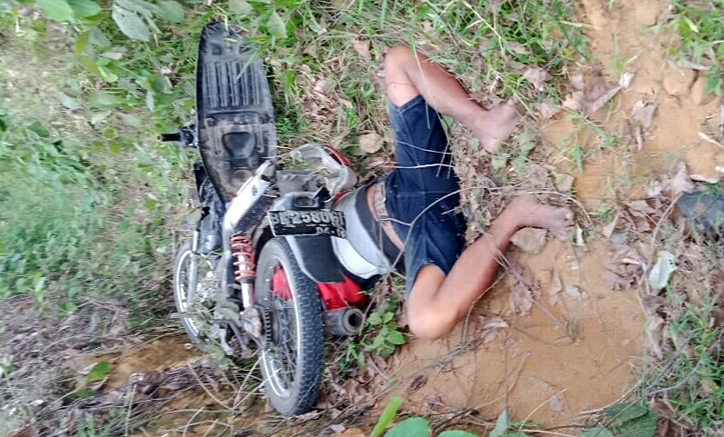 Kapolsek Pagar Merbau AKP Sopar Budiman mengatakan korban ditemukan pukul 17.55 WIB dengan posisi tubuh tertimpa sepeda motor jenis Honda Supra.