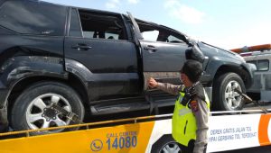 “Sesampainya di tempat kejadian tiba tiba ban belakang sebelah kiri mobil itu pecah kemudian oleng tidak terkendali sehingga terbalik dan menabrak gadril pembatas jalan,’’ ujar Ipda Robert, Rabu (10/6).