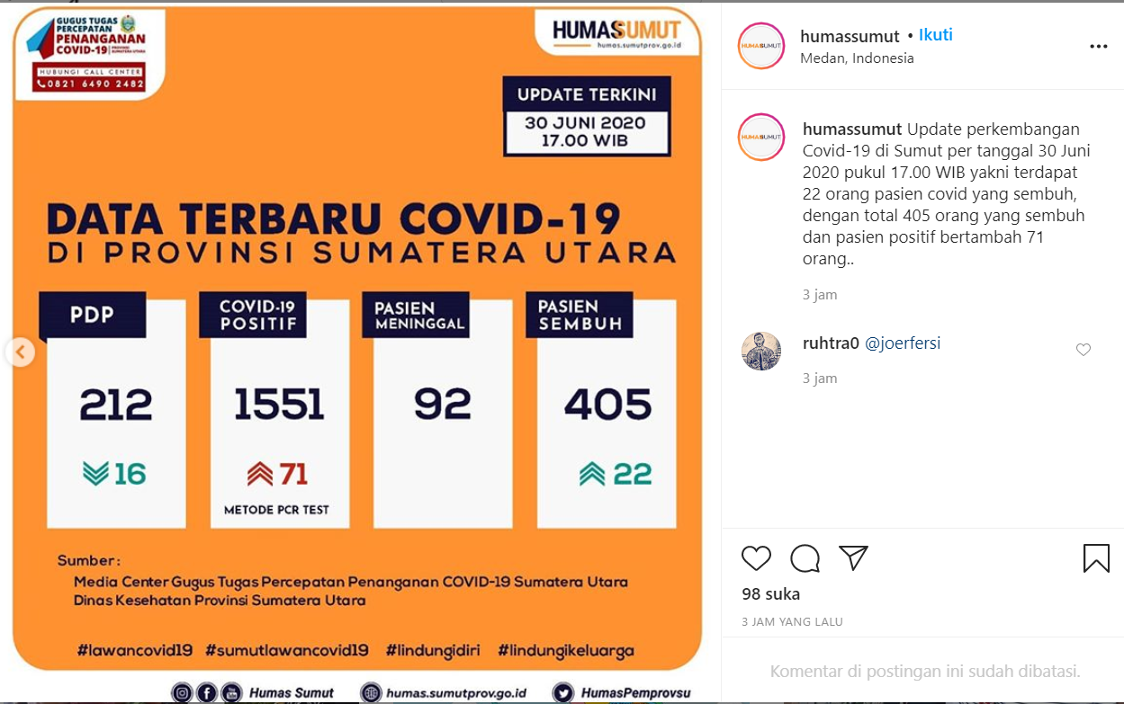 “Pasien positif COVID-19 berdasarkan PCR berjumlah 1.551 orang,” kata Juru Bicara GTPP Covid-19 Sumut, dr. Aris Yudhariansyah.