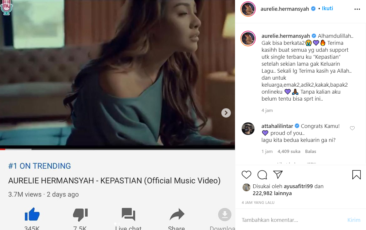 Alhamdulillah.. Gak bisa berkata-kata. Terima kasihh buat semua yg udah support utk single terbaru ku “Kepastian” setelah sekian lama gak Keluarin Lagu.. Sekali lg Terima kasih ya Allah.. dan untuk keluarga, emak2, adik2, kakak, bapak2 onlineku. Tanpa kalian aku belum tentu bisa sprt ini..” tulis Aurel