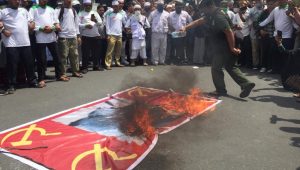 indiespot.id – Medan, Aksi ratusan orang berunjuk rasa di depan Lapangan Merdeka Medan, Minggu (5/7). Mereka menolak Rancangan Undang-Undang Haluan Ideologi Pancasila (RUU HIP) dan membakar replika bendera PKI yang berlambang palu arit.
