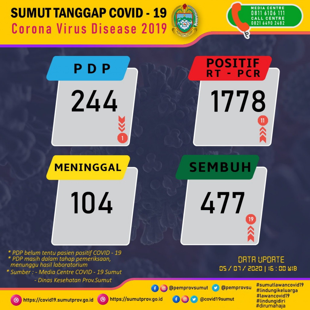 Indiespot.id-Medan. Gugus Tugas Percepatan Penanganan (GTPP) Covid-19 Sumatera Utara kembali merilis data perkembangan kasus virus corona di Sumut. Per Minggu (05/07) tercatat penambahan 11 kasus baru dalam 24 jam terakhir.