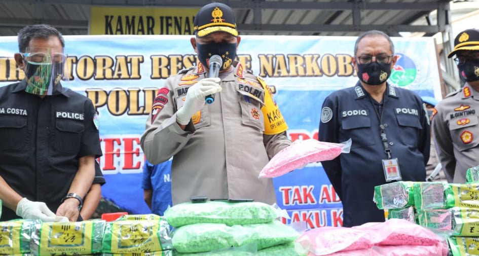 Kapolda Sumut mengatakan dari hasil barang bukti yang disita berupa 100 kg Sabu berhasil menyelamatkan 1 juta anak bangsa serta 50 ribu butir pil ekstasi berhasil menyelamatkan 50 ribu anak bangsa