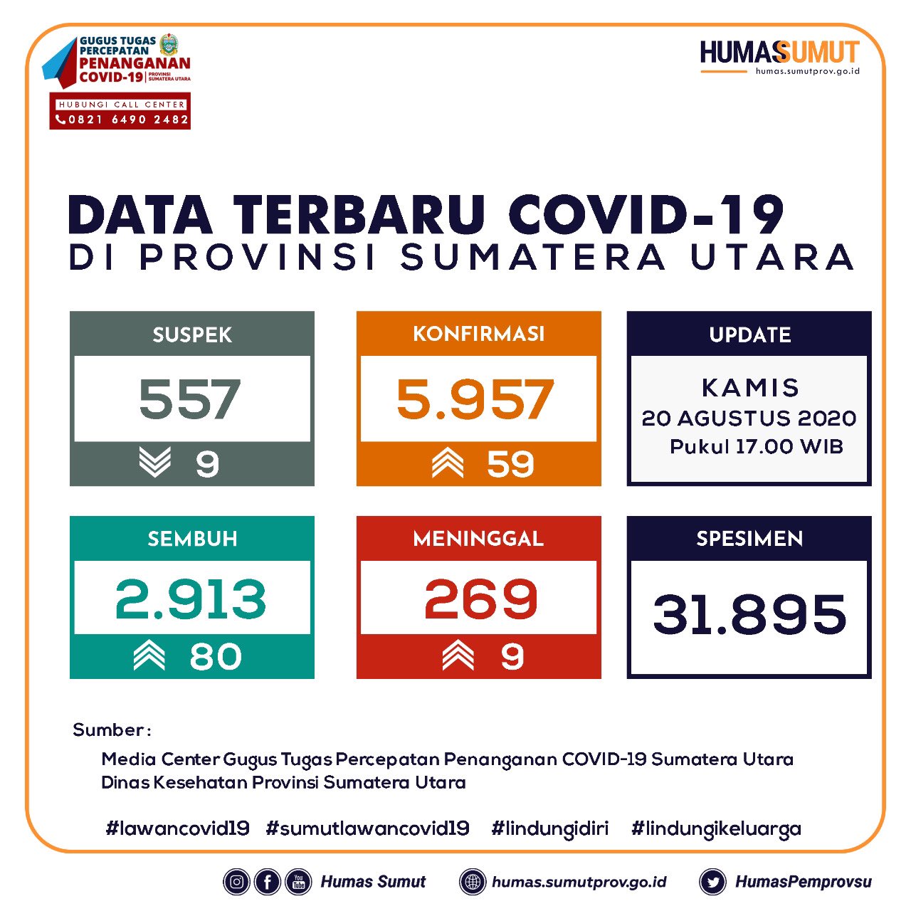 Indiespot.id-Medan. Penyebaran virus corona masih terus terjadi di Sumatera Utara. Berdasarkan data GTPP Covid-19 Sumut, per Kamis (20/08) kasus positif corona meningkat sebanyak 59 orang.