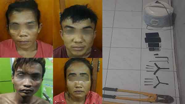 Adapun barang bukti yang disita dari para tersangka berupa 2 unit kunci letter Y dan Letter L, 6 unit anak kunci letter T, 1 unit magnet kunci, 4 unit handphone, 1 unit gunting potong, 2 buah jaket merah dan biru, 1 unit rice cooker dan rekaman CCTV dari Medsos.