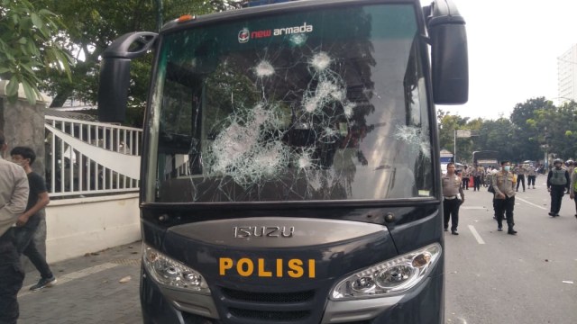 Indiespot.id-Medan. Sejumlah kendaraan dinas polisi di Medan dirusak massa demonstran penolakan UU Omnibus Law, Kamis (8/10). Kendaraan dinas yang dirusak meliputi mobil sedan, minibus, dan bus kepolisian.