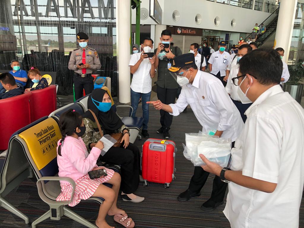 Selain melakukan peninjauan, Menhub juga membagi-bagikan masker gratis bagi para pengguna jasa, staf pihak ground handling, dan staf bandara.