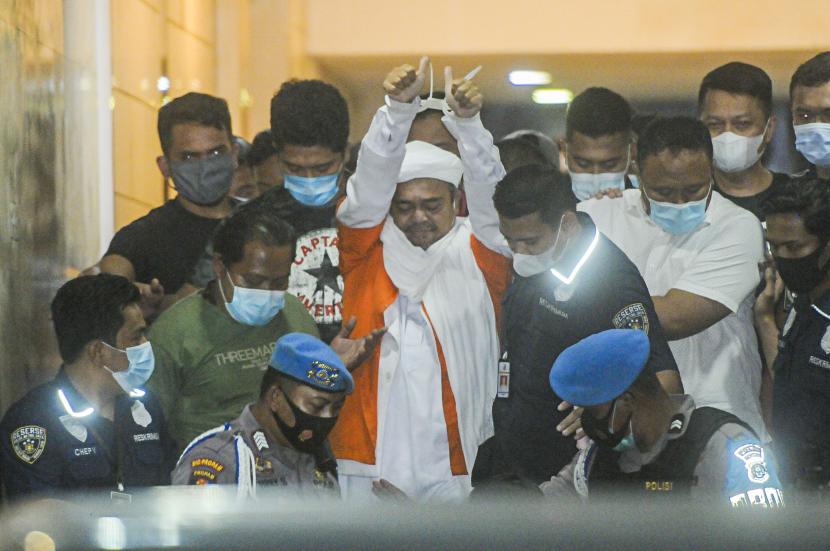 Rizieq Shihab ditahan sebagai sebagai tersangka dalam kasus kerumunan dalam akad nikah putrinya, Syarifah Najwa Shihab, di Petamburan, Jakarta Pusat, 14 November 2020 Rizieq Shihab diperiksa sejak pukul 11.00 Wib dan selesai pukul 22.00 Wib, Sabtu (12/12).