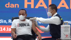 Edy tampak hadir dengan menggunakan kemeja putih dan didalamnya menggunakan kaos putih bertuliskan “INDONESIA”. Sebelum divaksin, terlebih dahulu Edy melalukan pendaftaran dan verifikasi serta cek kesehatan guna memastikan dirinya tidak menderita penyakit komorbid yang tidak dianjurkan menerima vaksin.