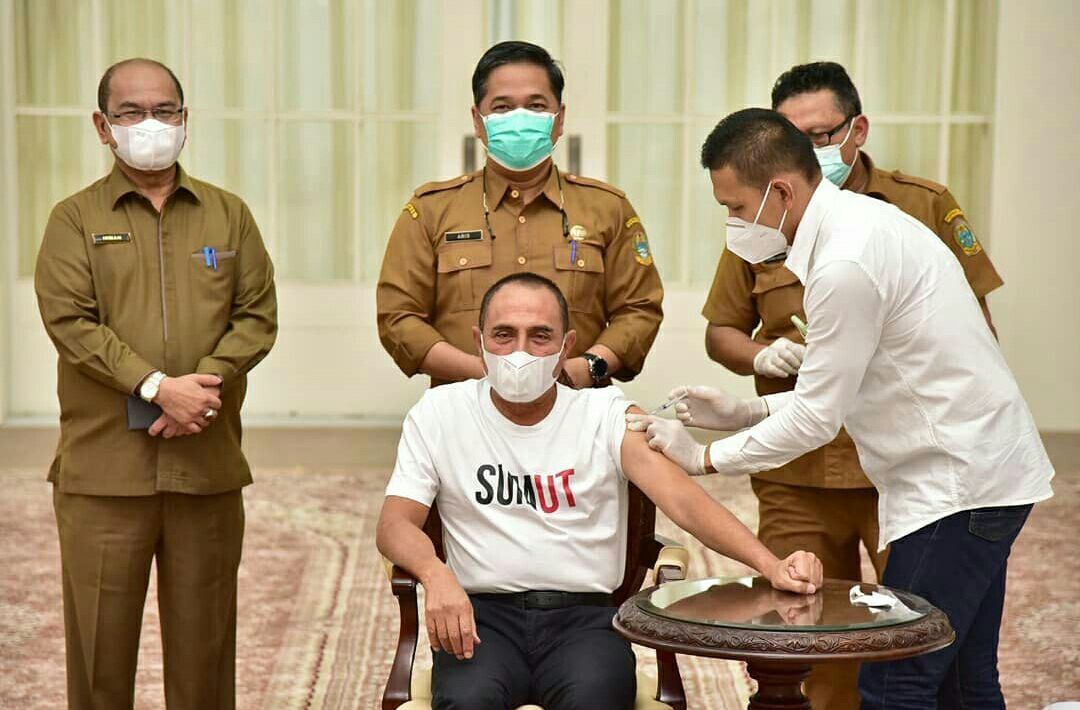 “Gubernur harus divaksin untuk membuktikan kepada tenaga kesehatan sebagai pejuang yang menangani Covid19 termasuk aparat keamanan dan memastikan vaksin ini aman dan halal, kalau sudah Gubernur melakukan vaksin, berarti tenaga kesehatan harus mau,” kata Edy Rahmayadi, didampingi Kepala Dinas Komunikasi dan Informatika Sumut Irman Oemar dan Sekretaris Dinas Kesehatan Sumut Aris Yudhariansyah.