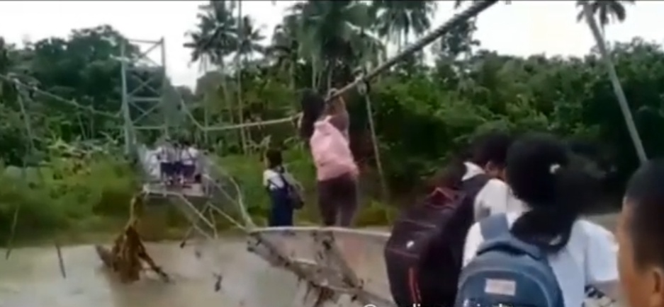 Dalam video tersebut, tampak sekompok siswi memakai baju SMP melewati jembatan yang hancur. Saat itu yang tersisa hanya lantai jembatan yang keropos dan seutas tali jembatan yang melintangi sungai.