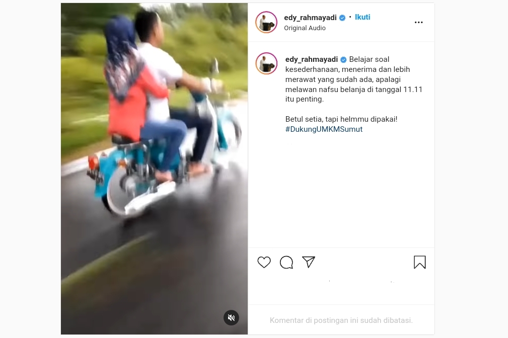 INDIESPOT.ID, Medan – Gubernur Sumatera Utara, Edy Rahmayadi tiba-tiba memposting video lucu yang menayangkan sepasang lelaki dan perempuan sedang mengendarai sepeda motor tua tanpa menggunakan helm yang disertai voice kocak yang menjelaskan tentang lelaki yang setia. Dalam video tersebut dikatakan bahwa kesederhanaan dan kesetiaan dalam merawat sesuatu yang kita miliki sangat penting dilakukan daripada terus membeli yang baru.