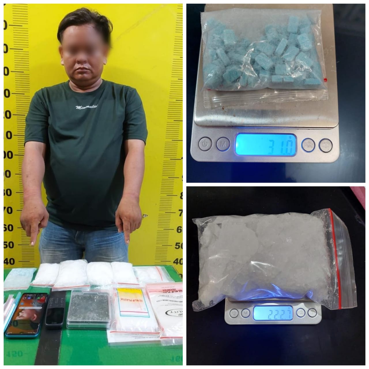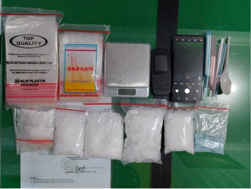 Ketika dilakukan penggeledahan ke rumah kontrakan pelaku, petugas menemukan 5 bungkus besar berisi narkotika jenis shabu dengan berat keseluruhan 609,3 gram dan 75 butir narkotika jenis Extasi.