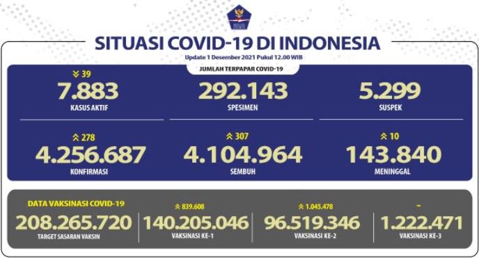 INDIESPOT.ID, Jakarta – Perkembangan penanganan pandemi COVID-19 per 1 Desember 2021 secara nasional, angka kesembuhan harian bertambah mencapai 307 orang sembuh per hari. Adanya penambahan hari ini meningkatkan angka kumulatif kesembuhan hingga menembus angka 4,1 juta orang sembuh atau tepatnya 4.104.964 orang (96,4%).
