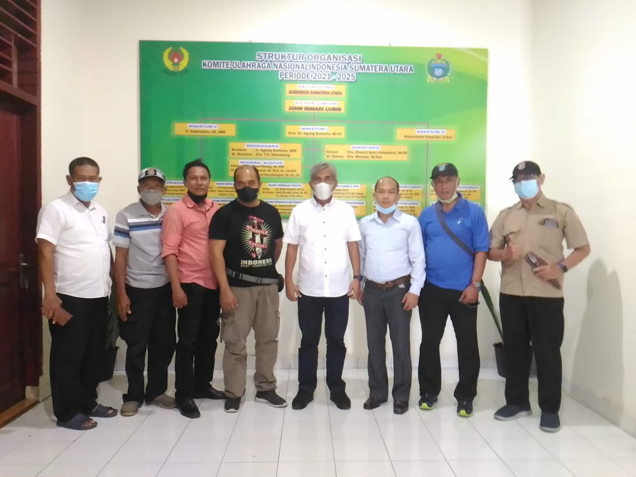 Saat audiensi hadir Ketua Porlempika, Sumut Jefri Gunawan Pakpahan dan Sekertarsinya, Ahmad Sani. Mereka, diterima Ketua Koni Sumut John Ismadi Lubis yang dampingi Wakil Ketua I Prof Agung.