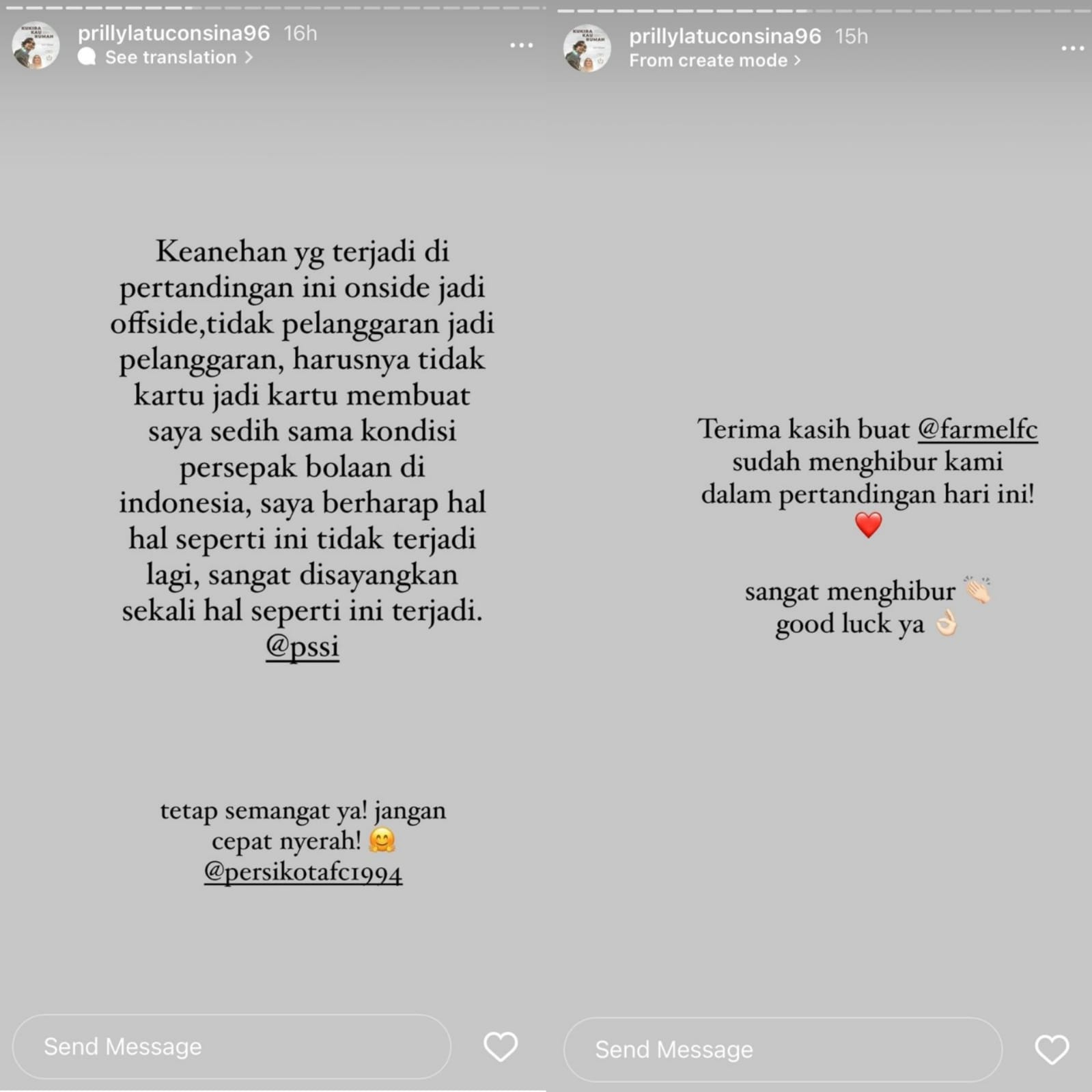 “Keanehan yang terjadi di pertandingan ini onside jadi offside, tidak pelanggaran jadi pelanggaran, seharusnya tidak kartu menjadi tidak kartu. Membuat saya sedih sama kondisi persepakbolaan di Indonesia. Saya berharap hal seperti ini tidak terjadi lagi, sangat disayangkan sekali hal ini seperti terjadi. @pssi,” kata Prilly.