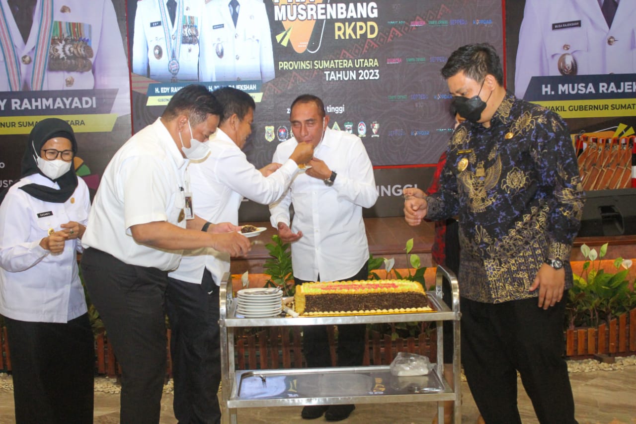 Pada kesempatan itu para KDH yang hadir turut memberikan kejutan ucapan selamat ulang tahun kepada Gubernur Edy Rahmayadi. Mereka juga mengulangi kue ulang tahun kepada orang nomor satu di Provinsi Sumut itu. Sebaliknya Gubernur Edy juga menyulangi mereka.
