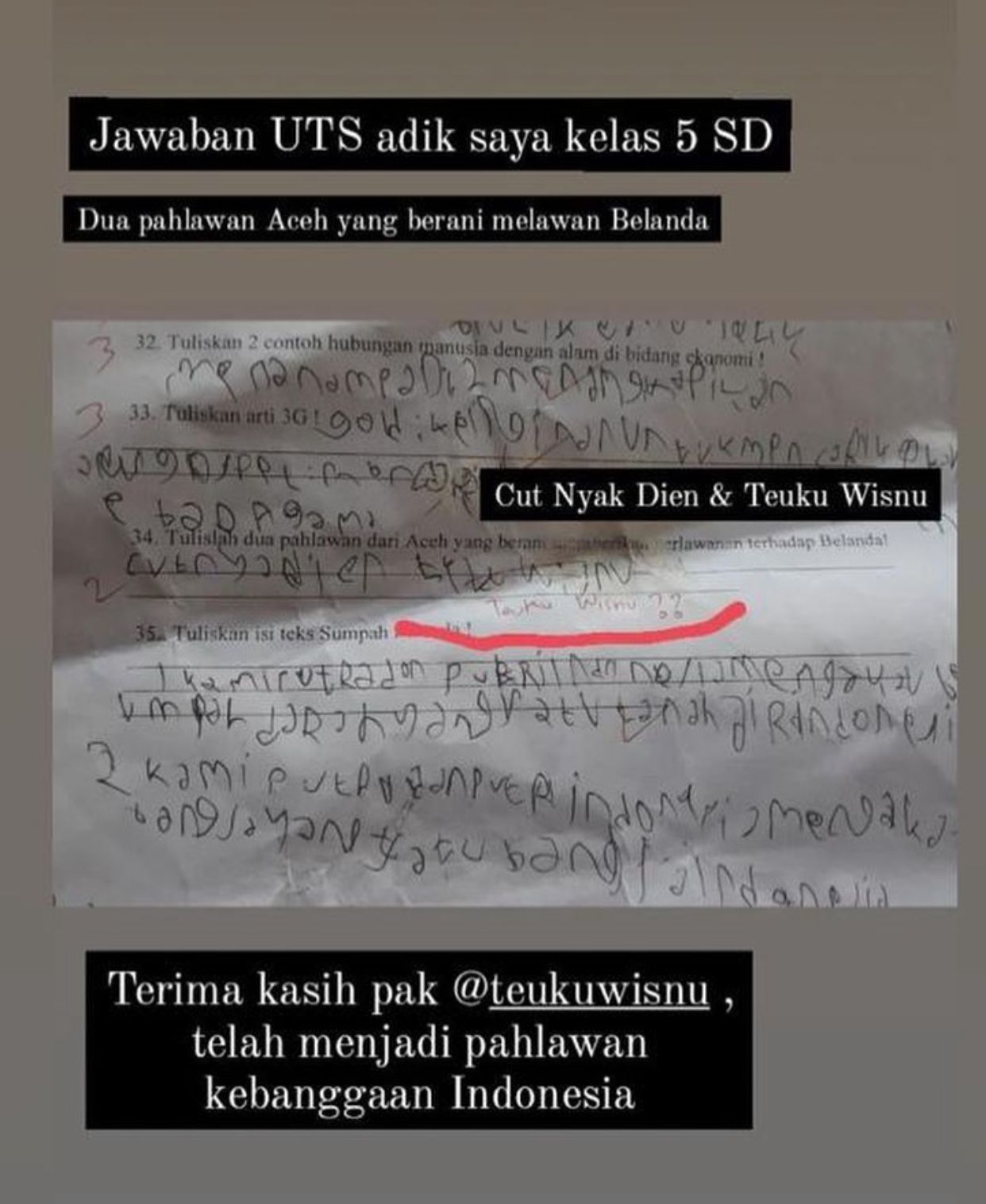 “Jawaban UTS adik saya kelas 5 SD. Dua Pahlawan Aceh yang berani melawan Belanda, Cut Nyak Dhien dan Teuku Wisnu. Terima kasih pak @teukuwisnu telah menjadi pahlawan kebanggaan Indonesia,” tulis akun @tazkiarp melalui Insta Story yang kemudian diunggah ulang oleh suami Shiren Sungkar itu.