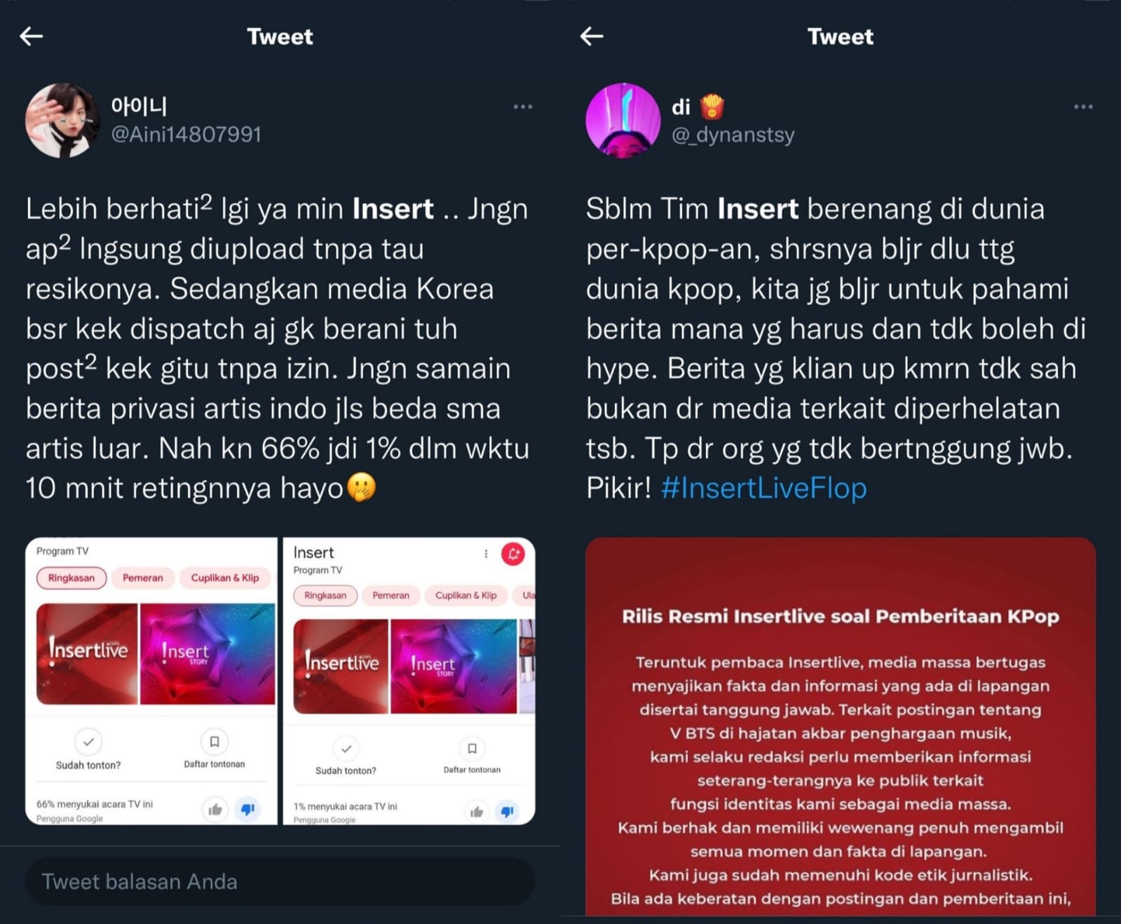 “Sebelum Tim Insert berenang di dunia per-kpop-an, seharusnya belajar dulu tentang dunia kpop, kita juga belajar untuk pahami berita mana yang harus dan tidak boleh di hype. Berita yang klian up kemarin tidak sah bukan dsri media terkait diperhelatan tersebut. Tapi dari orang yang tidak bertanggung jawab. Pikir! #InsertLiveFlop,” tulis @_dynanstsy.