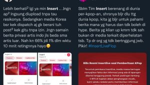 “Sebelum Tim Insert berenang di dunia per-kpop-an, seharusnya belajar dulu tentang dunia kpop, kita juga belajar untuk pahami berita mana yang harus dan tidak boleh di hype. Berita yang klian up kemarin tidak sah bukan dsri media terkait diperhelatan tersebut. Tapi dari orang yang tidak bertanggung jawab. Pikir! #InsertLiveFlop,” tulis @_dynanstsy.
