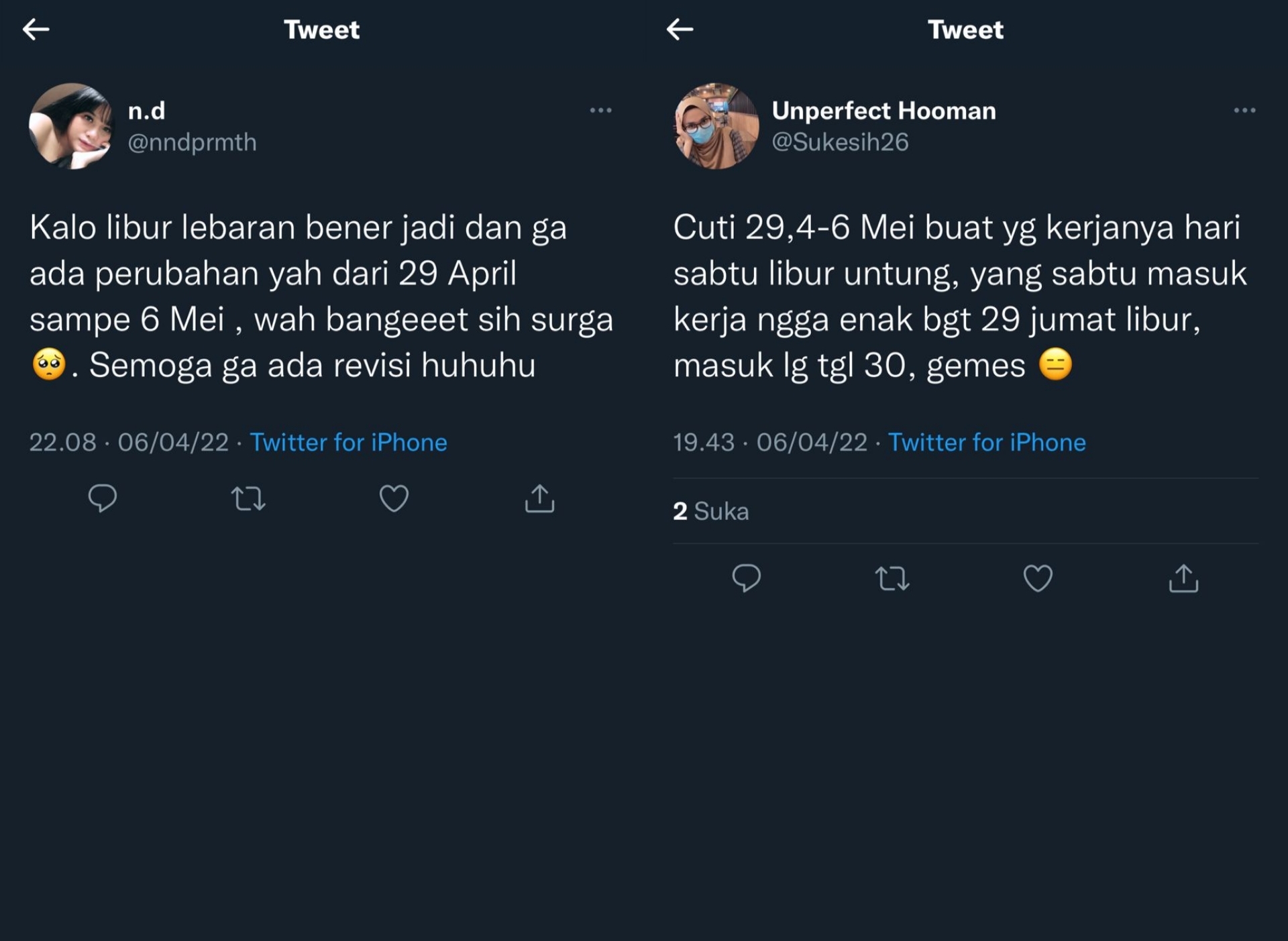 “Kalo libur lebaran bener jadi dan ga ada perubahan yah dari 29 April sampe 6 Mei , wah bangeeet sih surga🥺. Semoga ga ada revisi huhuhu,” kata @nndprmth.