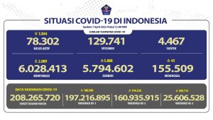 Sejalan itu, kasus aktif atau pasien positif yang membutuhkan perawatan medis, berkurang 3.844 kasus sehingga kumulatifnya 78.302 kasus (1,4%). Lalu, pasien terkonfirmasi positif (RT-PCR/TCM dan rapid antigen), hari ini bertambah 2.089 kasus terdiri 1.993 transmisi lokal dan 96 PPLN. Sehingga angka kumulatifnya, atau jumlah pasien terkonfirmasi positif yang tercatat sejak kasus pertama hingga hari ini mencapai 6.028.413 kasus.