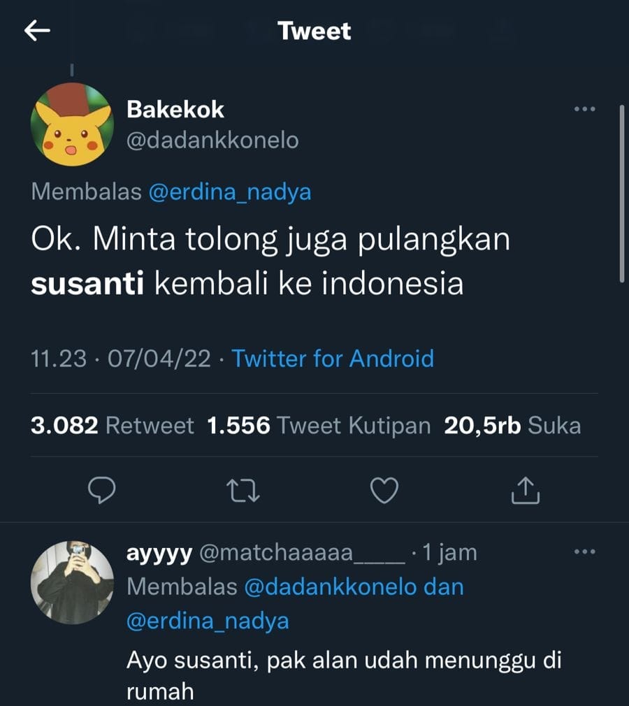 “Ok. Minta tolong juga pulangkan susanti kembali ke Indonesia,” cuit @dadankkonelo.