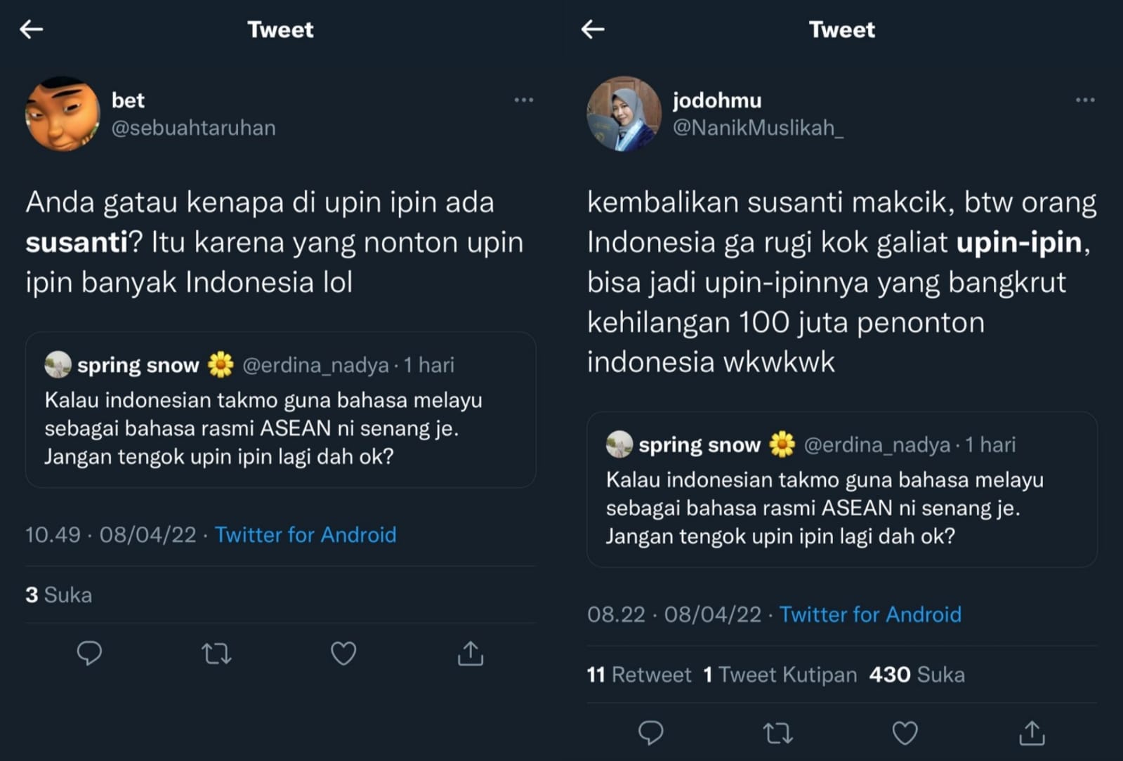 ”Kalau Indonesian takmo guna bahasa melayu sebagai bahasa rasmi ASEAN ini senang je. Jangan tengok upin ipin lagi dah ok? (Kalau masyarakat Indonesia tidak mau menerima Bahasa Melayu sebagai bahasa resmi ASEAN mudah saja. Jangan tonton Upin Ipin lagi ok?)” cuit akun tersebut.