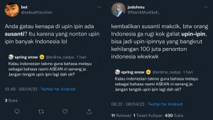 ”Kalau Indonesian takmo guna bahasa melayu sebagai bahasa rasmi ASEAN ini senang je. Jangan tengok upin ipin lagi dah ok? (Kalau masyarakat Indonesia tidak mau menerima Bahasa Melayu sebagai bahasa resmi ASEAN mudah saja. Jangan tonton Upin Ipin lagi ok?)” cuit akun tersebut.
