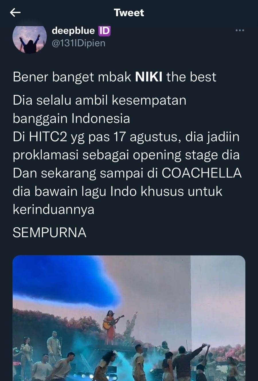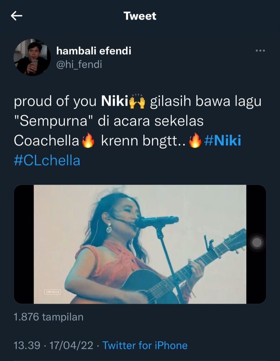 Dari pantauan redaksi Indiespot, Senin (18/4/2022) pukul 12.47 WIB kata kunci “Niki” sudah diramikan 105ribu cuitan netizen. Banyak netizen yang membagikan video penampilan Niki di panggung Coachella. Terlebih lagi Niki membawakan lagu Sempurna Dari Andra and The Backbone.