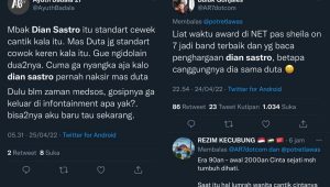 Kicauan tentang Dian Sastro pada Senin (25/4/2022) pukul 13.19 WIB, sudah mencapai 2.786 tweets. Banyak netizen yang membicarakan rumor tak jelas soal Dian Sastro yang pernah menyatakan cinta pada Duta. Meski cuma kabar angin dan rumor belaka, nyatanya cerita soal Duta menolak Dian Sastro seperti dibenarkan oleh mayoritas netizen.