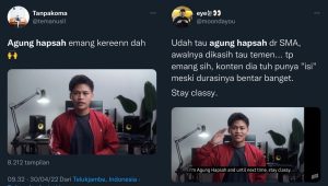 “Agung Hapsah emang keren sih dari dulu. Tanpa lempar embel-embel “edukasi”, konten dia mengedukasi. Viewers dia pun bertambah dewasa seiring konten-konten dia yang juga tambah cakep dari segi tampilan dan isi,” kata @riswanmawan.