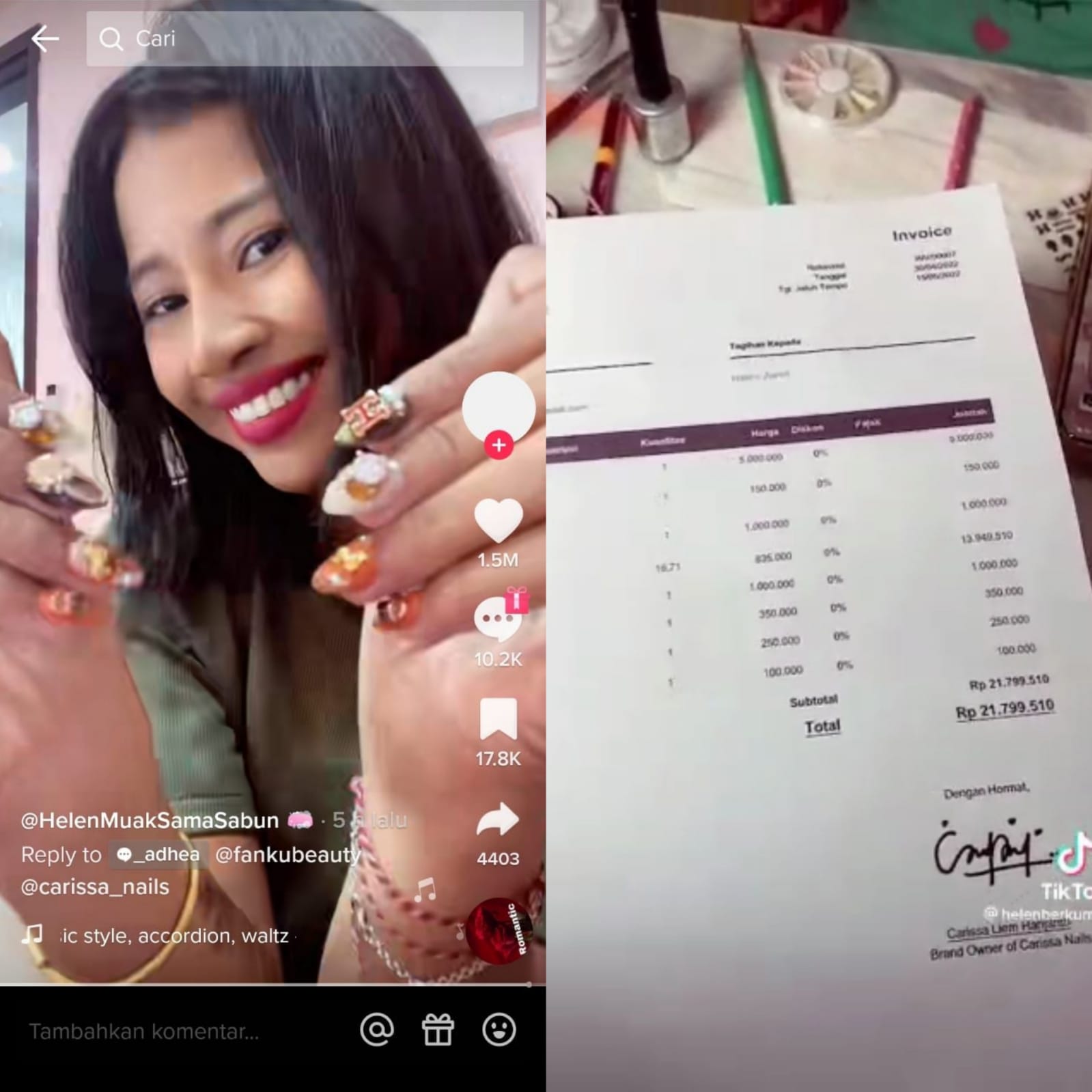 “Dalam rangka menyambut Lebaran aku gak mau ketinggalan menghias diri dan aku memperindah kuku-kukuku dan jemari lentikku menggunakan emas-emas asli seharga Rp 13,8 juta. Kalian penasaran bagaimana hasilnya?” kata akun TikTok @helenberkuman.