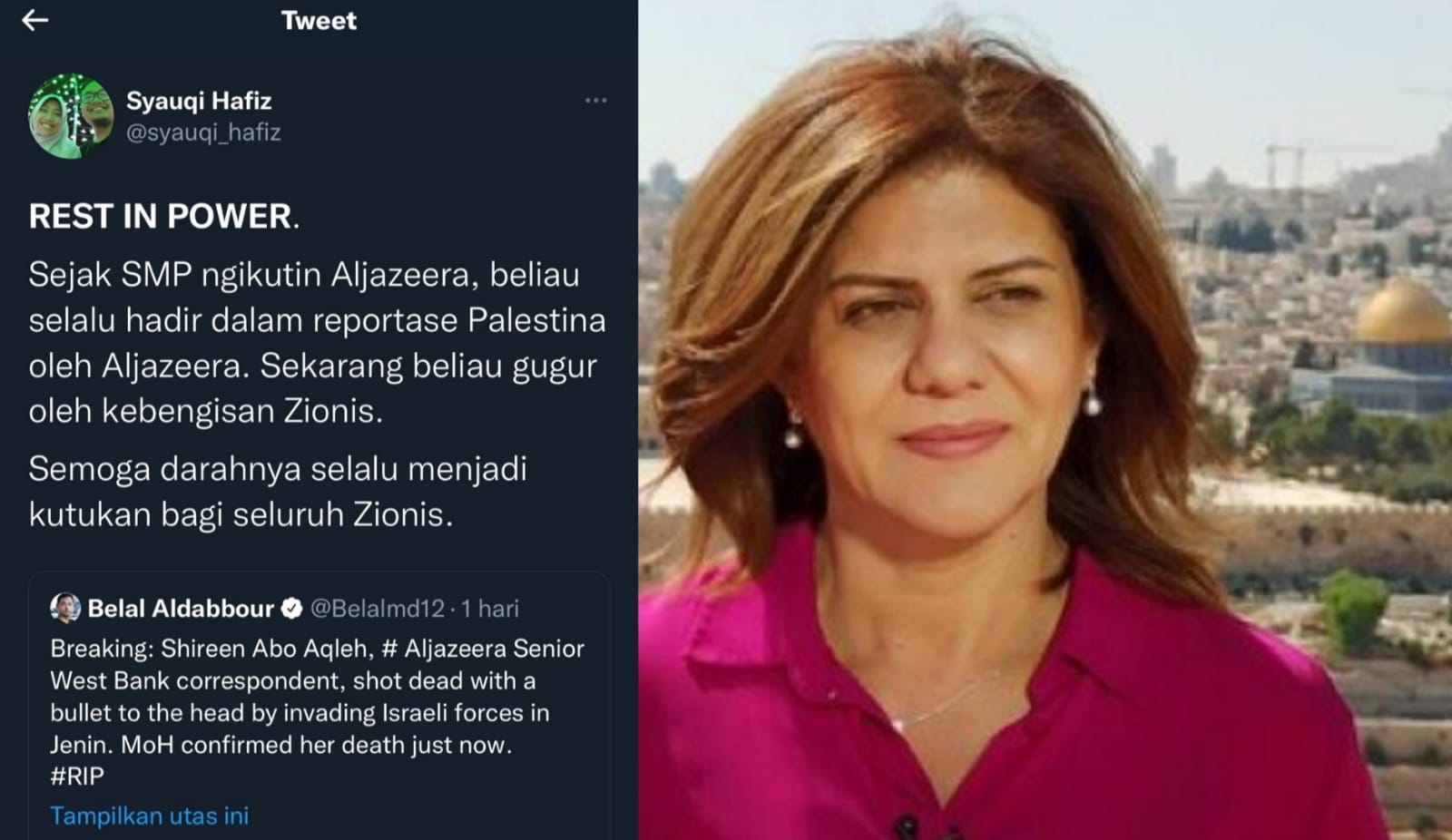 “Rest in Power. Sejak SMP ngikutin Aljazeera, beliau selalu hadir dalam reportase Palestina oleh Aljazeera. Sekarang beliau gugur oleh kebengisan Zionis. Semoga darahnya selalu menjadi kutukan bagi seluruh Zionis,” cuit @syauqi_hafiz.