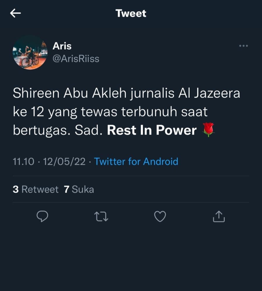 “Shireen Abu Akleh jurnalis Al Jazeera ke 12 yang tewas terbunuh saat bertugas. Sad. Rest In Power,” kata @ArisRiiss.