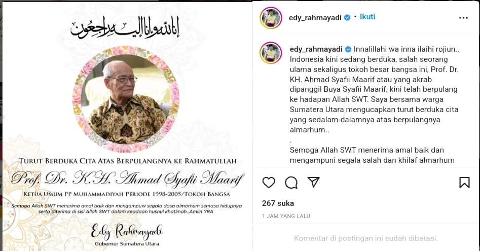 “Saya bersama warga Sumatera Utara mengucapkan turut berduka cita yang sedalam-dalamnya atas berpulangnya almarhum,” tulisnya.