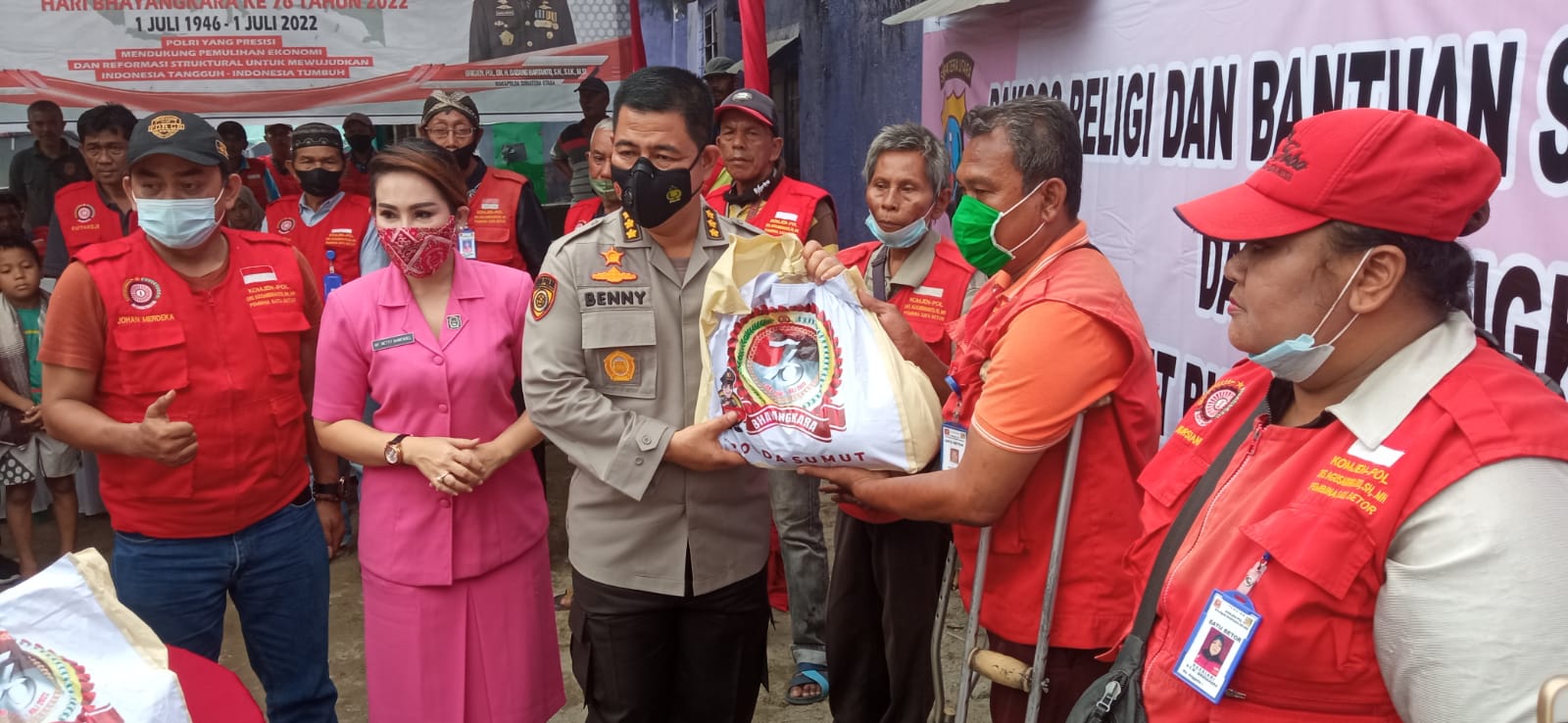 “Mulai tadi pagi hingga sore ini kita melaksanakan kegiatan bakti sosial dan bantuan sosial dan tadi sudah dibuka langsung oleh Kapolri melalui Zoom Metting. Kegiatan ini dalam rangka Hari Bhayangkara ke-76 dengan memberikan sembako, bedah rumah, memberikan kursi roda dan kaki palsu yang telah dilakukan oleh Kapolda Sumut dan hari ini menyalurkan bantuan sembako Di Sumut kita laksanakan sebanyak 26.000 paket sembako,” katanya.