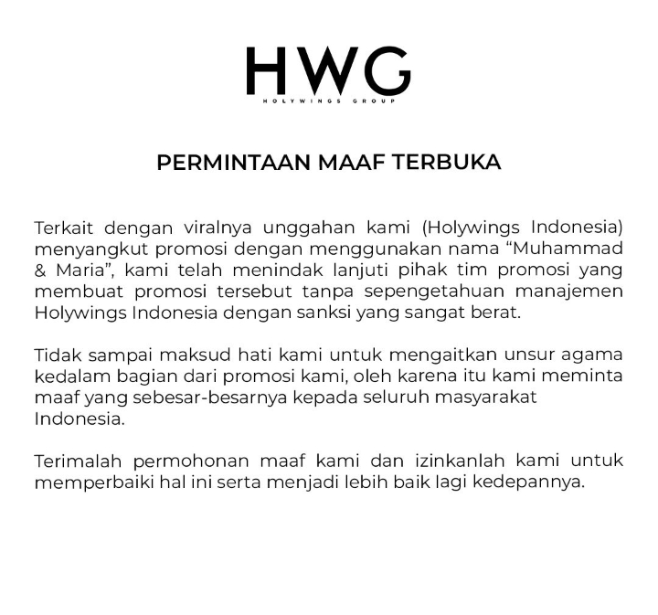 “Tidak sampai maksud hati kami untuk mengaitkan unsur agama kedalam bagian dari promosi kami, oleh karena itu kami meminta maaf yang sebesar-besarnya kepada seluruh masyarakat Indonesia. Terimalah permohonan maaf kami dan izinkanlah kami untuk memperbaiki hal ini serta menjadi lebih baik lagi kedepannya,” sambung Holywings.