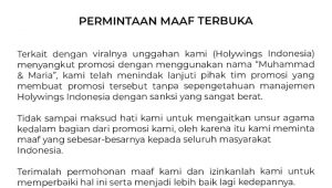 “Tidak sampai maksud hati kami untuk mengaitkan unsur agama kedalam bagian dari promosi kami, oleh karena itu kami meminta maaf yang sebesar-besarnya kepada seluruh masyarakat Indonesia. Terimalah permohonan maaf kami dan izinkanlah kami untuk memperbaiki hal ini serta menjadi lebih baik lagi kedepannya,” sambung Holywings.