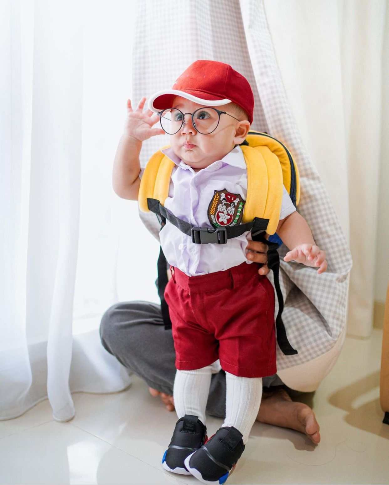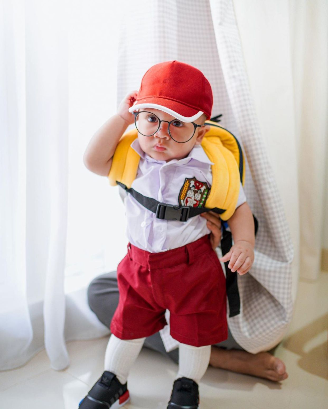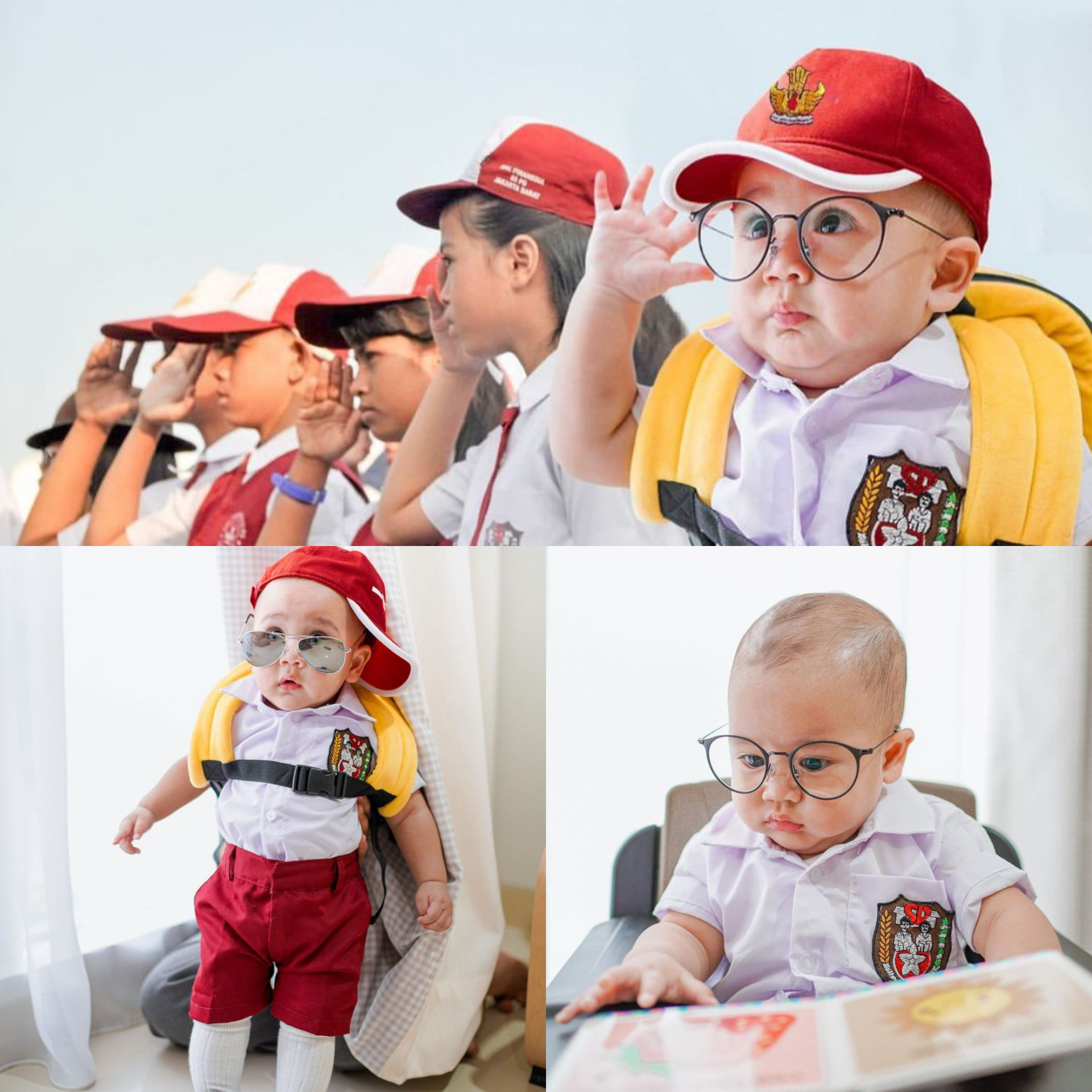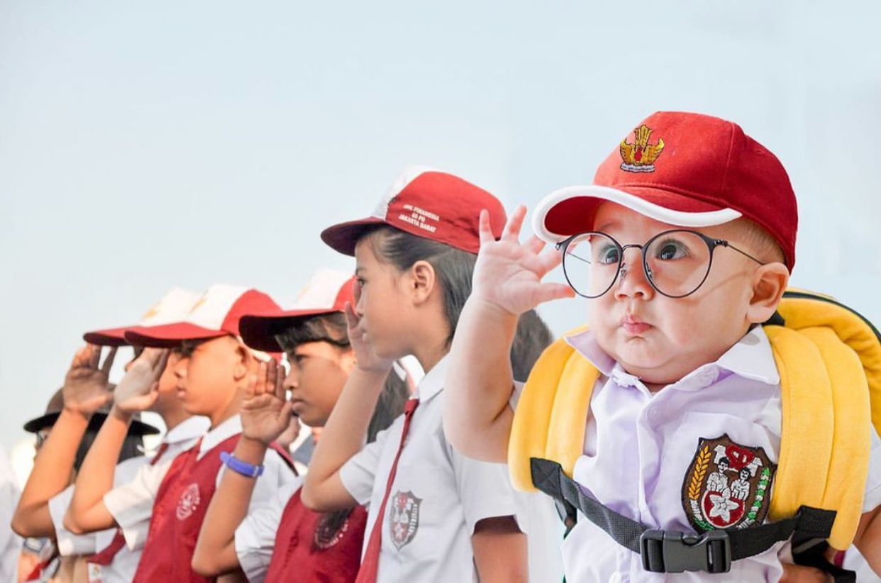 1. Dalam foto yang di unggah @raffinagita1717 terlihat Rayyanza seperti layaknya anak SD sungguhan. Ia terlihat lengkap menggunakan pakai sekolah itu. Mulai dari topi, seragam merah putih, tas, dan sepatu.
