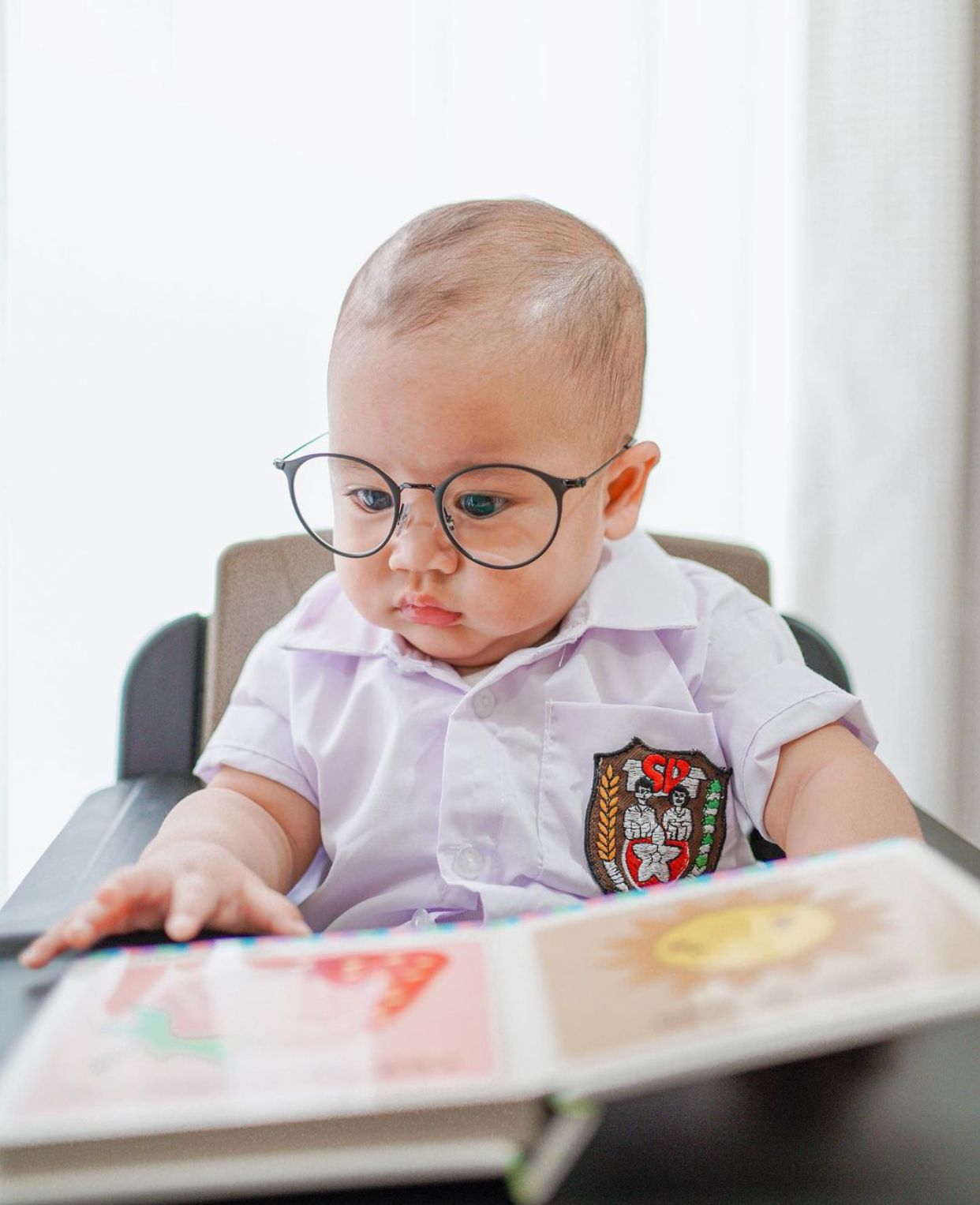 5. Seolah sedang mengikuti pelajaran di kelas, Rayyanz terlihat serius melihat buku yang ada di depannya.