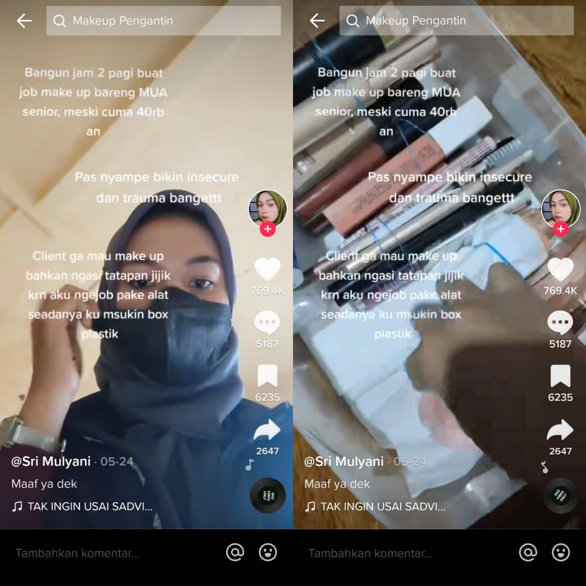 “Bangun jam 02.00 WIB pagi buat job makeup bareng MUA senior meski cuma Rp 40 ribu. Pas sampai bikin insecure dan trauma banget. Client gak mau makeup bahkan ngasi tatapan jijik karena aku nge-job pake alat seadanya ku masukin box plastik,” tulis keterangan dalam video itu.