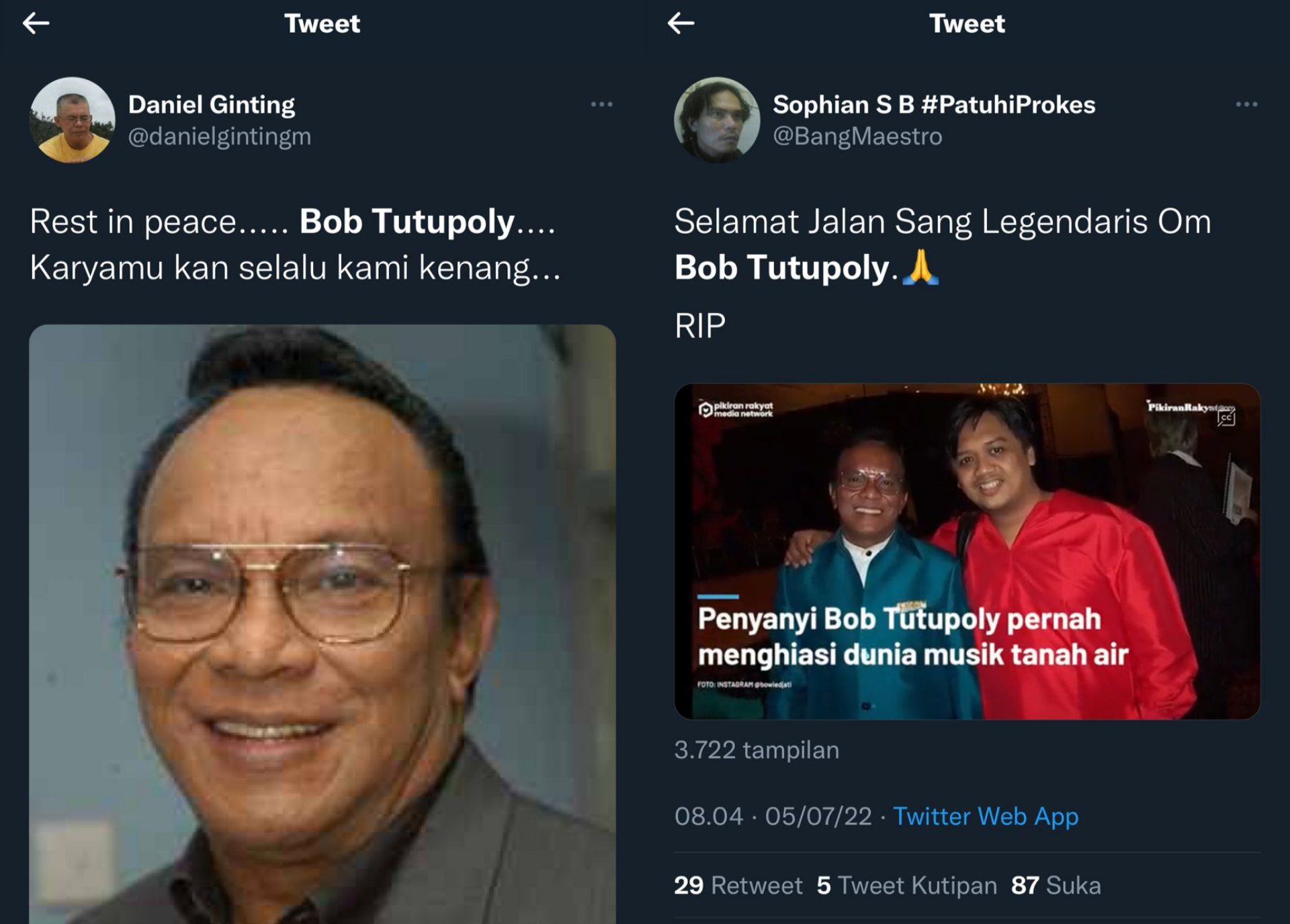 “Selamat Jalan Sang Legendaris Om Bob Tutupoly. RIP,” cuit @BangMaestro disertai dengan video Bob Tutupoly.