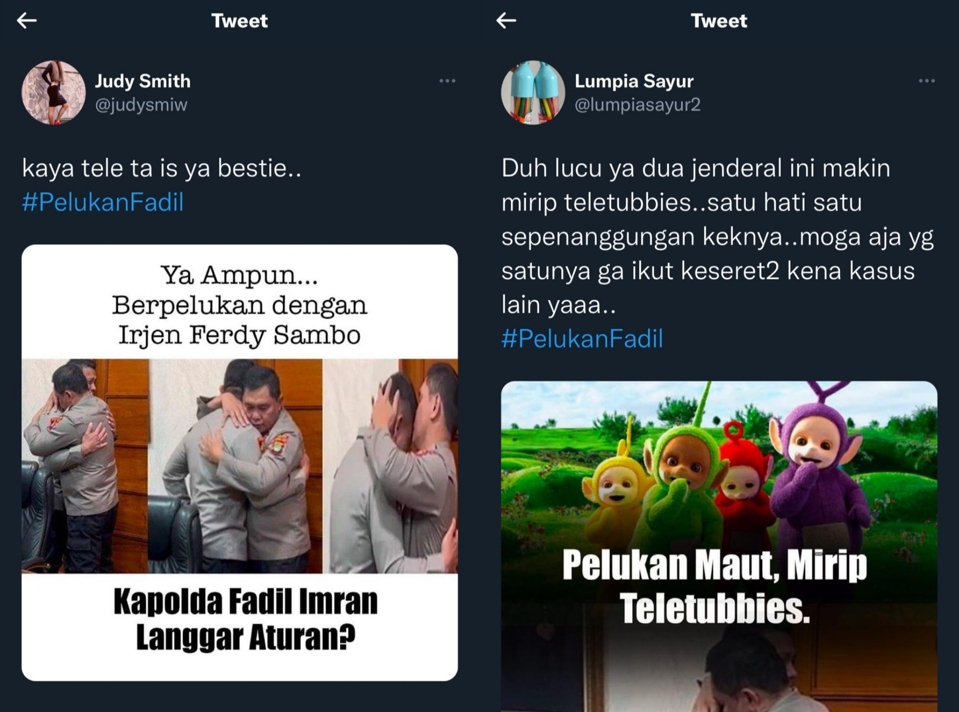 “Duh lucu ya dua jenderal ini makin mirip teletubbies..satu hati satu sepenanggungan keknya. Moga aja yg satunya ga ikut keseret-keseret kena kasus lain yaaa. #PelukanFadil,” kata @lumpiasayur2.