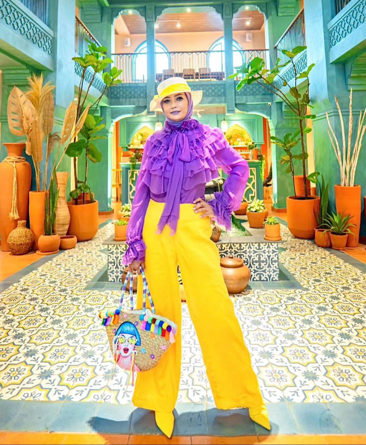 2. Kalau ini kamu akan terlihat lebih bold karena padu-padan warna ungu dan kuning. Tapi nggak masalah sih asal kamu percaya diri. Dengan tampilan ini kamu terlihat lebih cerah.